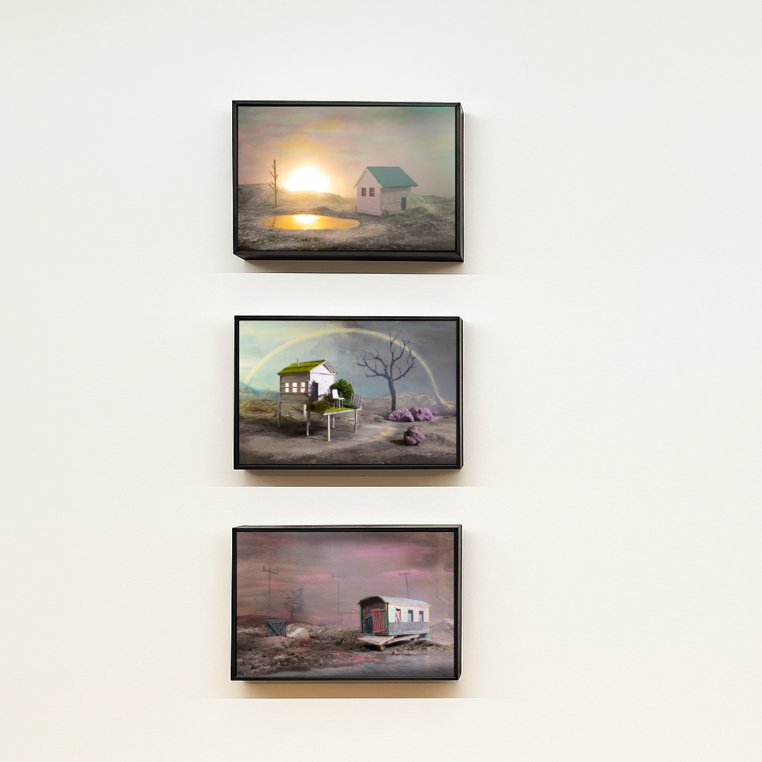 Op de vloer van haar studio bouwt Lisanne Hoogerwerf driedimensionale settings. Ze gebruikt hiervoor eenvoudige materialen zoals karton, houten stokjes en krijt. Haar landschappen bevinden zich in het schemergebied tussen fictie en realiteit, 2d en 3d. Vaak staan er in haar mysterieuze landschappen herkenbare elementen, zoals glijbanen, hutten en bomen. Met behulp van belichting en geschilderde panelen geeft Hoogerwerf gestalte aan een eigen wereld die ze vereeuwigd met haar camera.