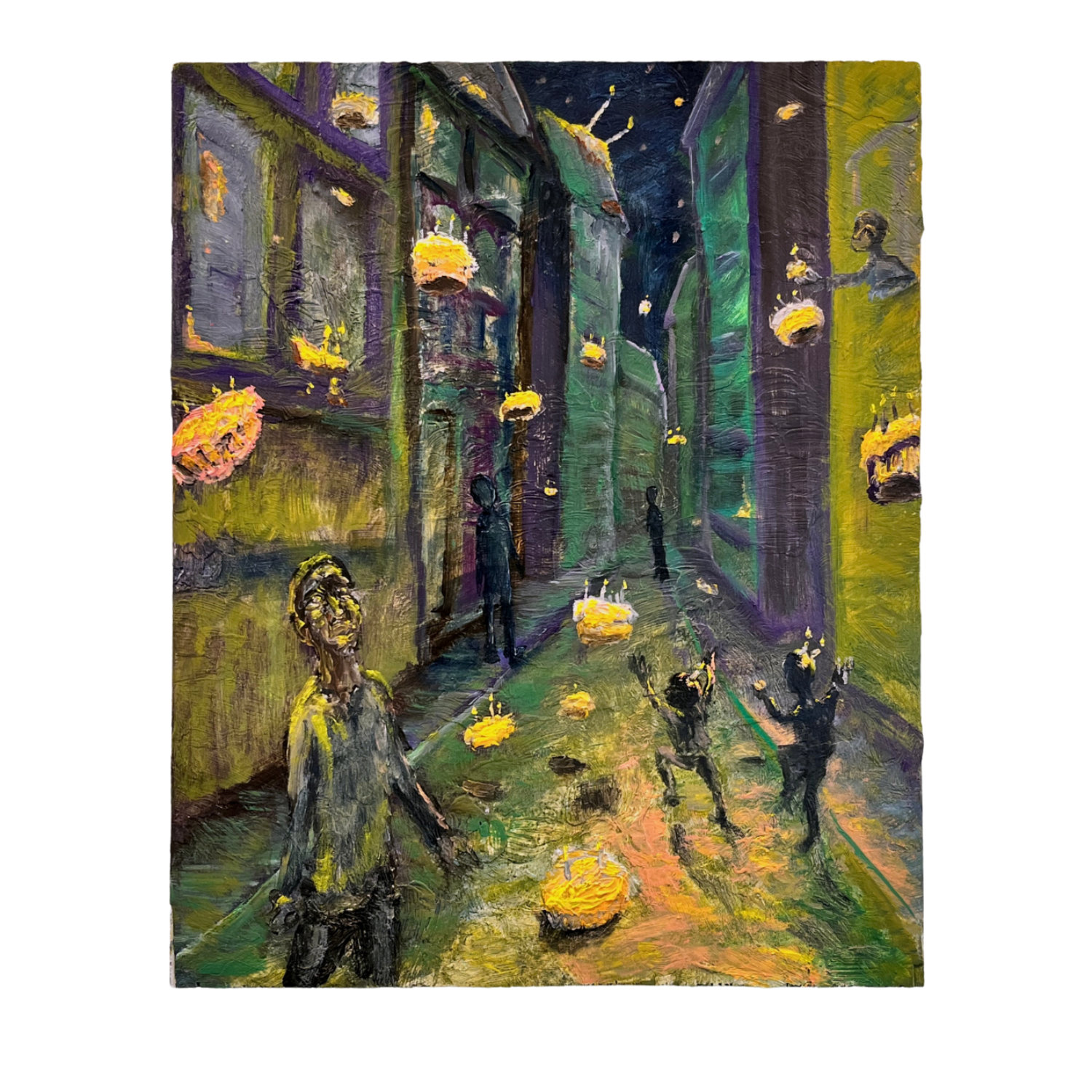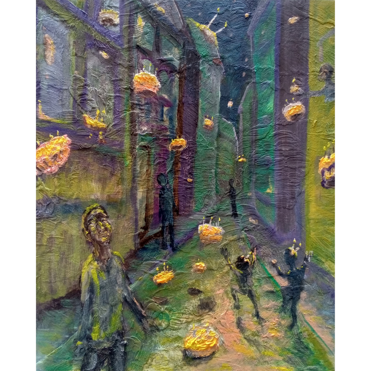In dit straatbeeld vallen uit de lucht plots allemaal taarten, zoals Manna, in het verhaal uit de bijbel.